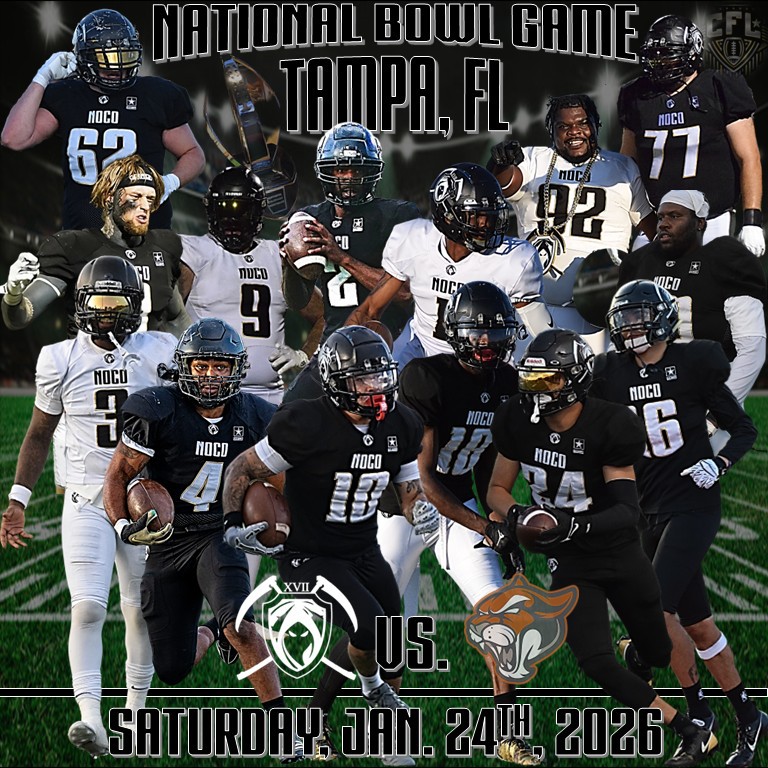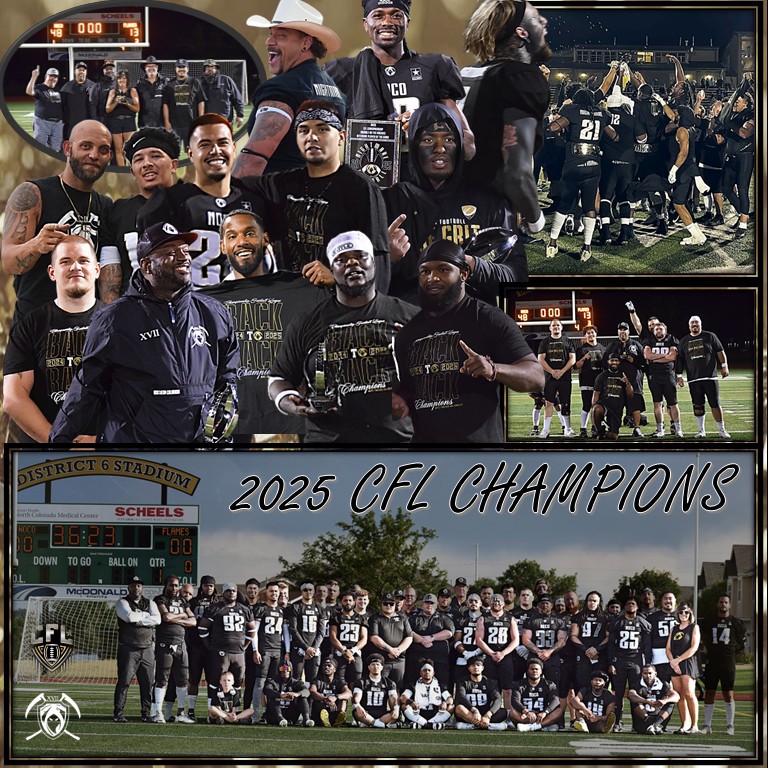 INTRODUCING YOUR 2025 CFL CHAMPIONS!!! IN A DOMINATING VICTORY OVER THE COLORADO SPRINGS FLAMES, 48-13 THEE NOTHERN COLORADO NIGHTMARE CLAIM BACK TO BACK TITLES. YOUR NIGHTMARE WILL NOW PLAY FOR A NATIONAL TITLE JANUARY 24, 2026 IN TAMPA FL AGAINST THE FLORIDA COUGARS.