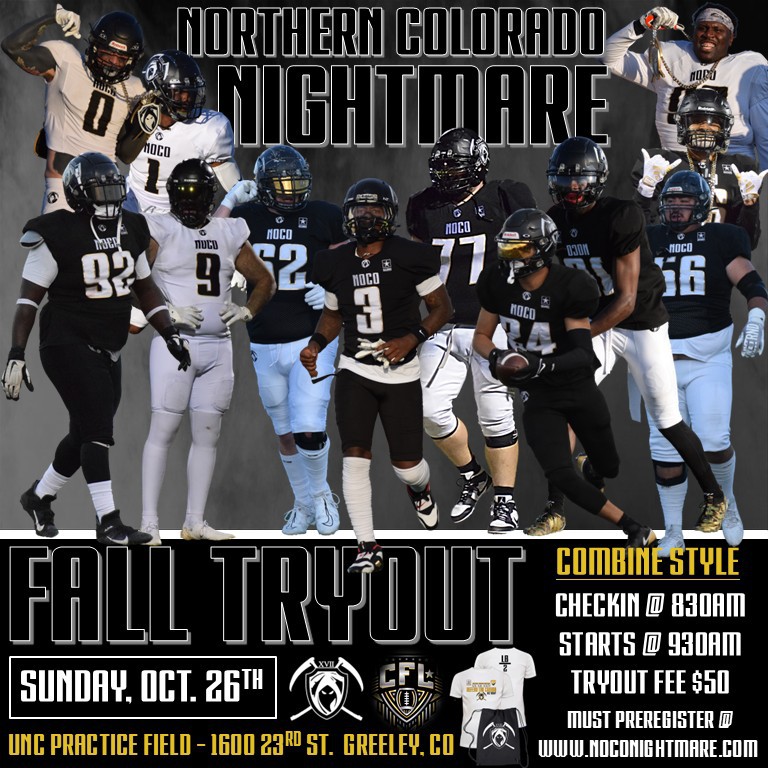 OPEN TRYOUTS ARE HERE!!! SEEKING SKILLED ATHLETES AT EVERY POSITION. SUNDAY, OCTOBER 26TH, AT THE UNIVERSITY OF NORTHERN COLORADO CAMPUS (PRACTICE FOOTBALL FIELD). PRE-REGISTRATION CAN BE FOUND UNDER THE "2025 FALL TRYOUT TAB". PAYMENTS MAY BE SENT VIA VENMO OR CASHAPP TO @NOCONIGHTMARETIX. PLEASE WEAR BLACK SHORTS OR SWEATS ONLY, YOU WILL RECIEVE A TRYOUT SHIRT THE MORNING OF. BRING WATER AND WEAR CLEATS. TRYOUT WILL BE COMBINE STYLE. AWARDS WILL BE GIVEN TO TOP PERFORMERS OF THE DAY. COME EXPERIENCE A DAY OF NIGHTMARE FOOTBALL AS OUR STAFF ASSESS YOUR SKILL SET. PLEASE EMAIL NIGHTMARENOCO@GMAIL.COM WITH ANY QUESTIONS.